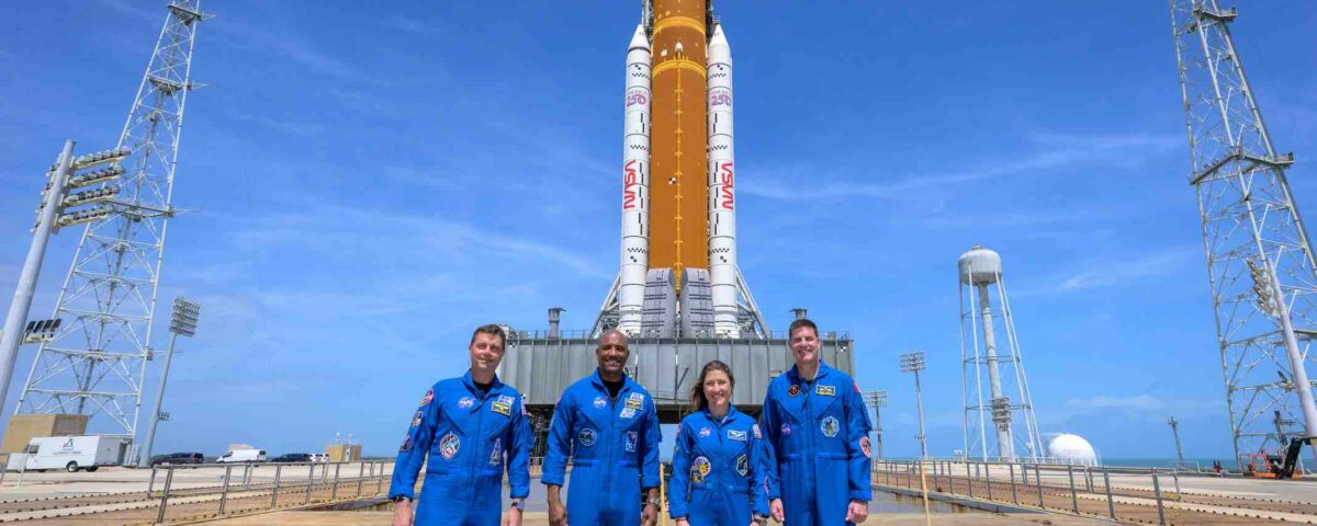 NASA astronauts Reid Wiseman, Artemis II commander, left, Victor Glover, Artemis II pilot, Christina Koch, Artemis II mission specialist, and CSA (Canadian Space Agency) astronaut Jeremy Hansen, Artemis II mission specialist, right, stop for a group photograph as they visit NASA’s Artemis II SLS (Space Launch System) rocket and Orion spacecraft, Monday, March 30, 2026, at Launch Complex 39B of NASA’s Kennedy Space Center in Florida. Photo Credit: (NASA/Bill Ingalls)